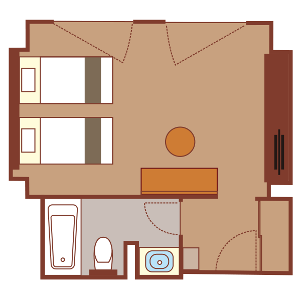 仙台市内中心部向きのお部屋なので、窓から外の景色をお楽しみいただける、広さ33.3㎡、ゆとりのデラックスツイン。エキストラベッドを入れて最大4名まで宿泊可能なので、ファミリーでの利用にもおすすめです。加湿空気洗浄機や広めのバスルーム、洗面台を備えた機能性はもちろん、ゆったりとした設えで心地よい時間を過ごせます。