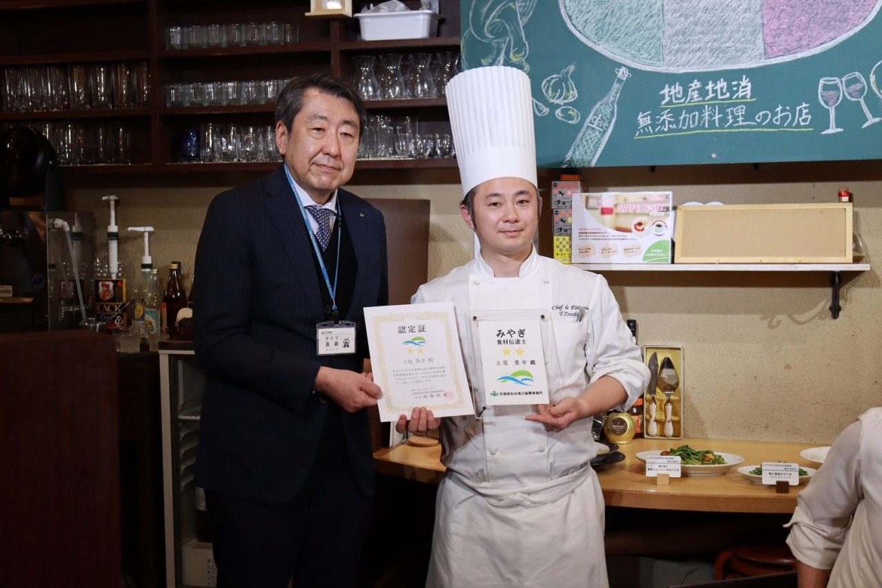 宮城県がその技術を認定した生産者様の元で、植え付けから収穫までの生産作業を実体験し、その苦労や収穫の喜び等を共に分かち合った料理人が認定される”みやぎ食材伝道士”。