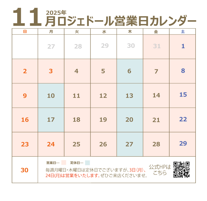 仙台国際ホテル5階の直営レストラン「ロジェドール」では、通常月曜日、木曜日にお休みをいただいておりますが、祝日につき11月3日(月)、24日(月)は営業を行います。