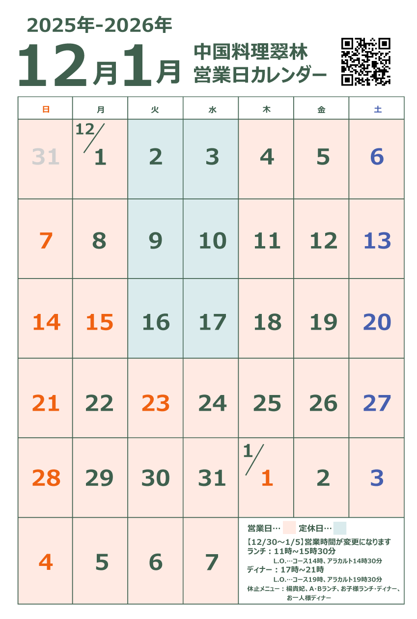 12月30日(火)、31日(水)、2026年1月6日(火)、7日(水)は年末年始につき営業いたします。12月30日(火)~2026年1月5日(月)は、営業時間が一部変更になる他、お席時間が2時間制になります。また、楊貴妃コース、A・Bランチ、お子様ランチ・ディナー、お一人様コースはお休みを頂戴します。あらかじめご了承くださいませ。