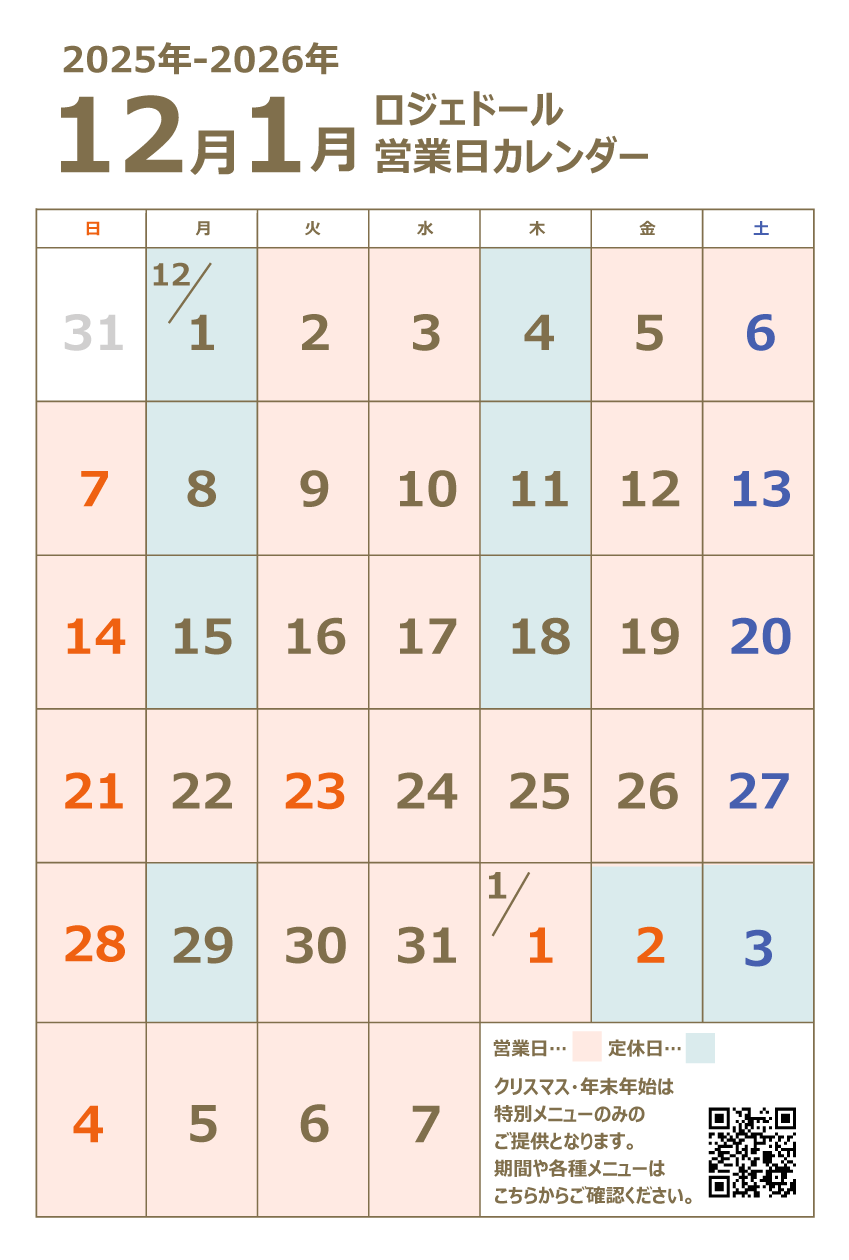 12月及び年末年始は特別に営業するお日にち、及び臨時休業日がございます。詳細は以下スケジュールをご確認ください。