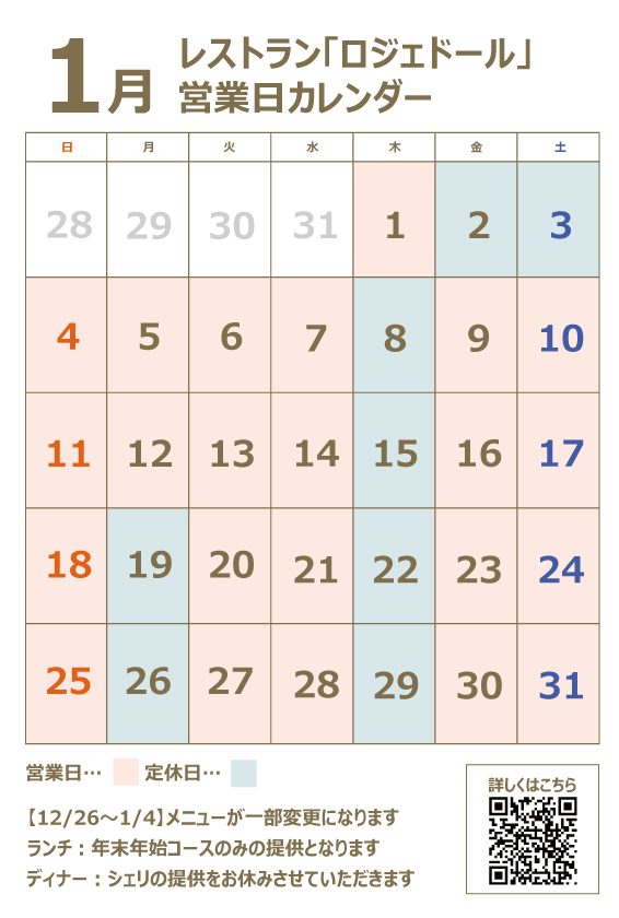 ロジェドールでは、通常月曜日・木曜日にお休みをいただいておりますが、1月は特別に営業するお日にちがございます。詳細は以下スケジュールをご確認ください。